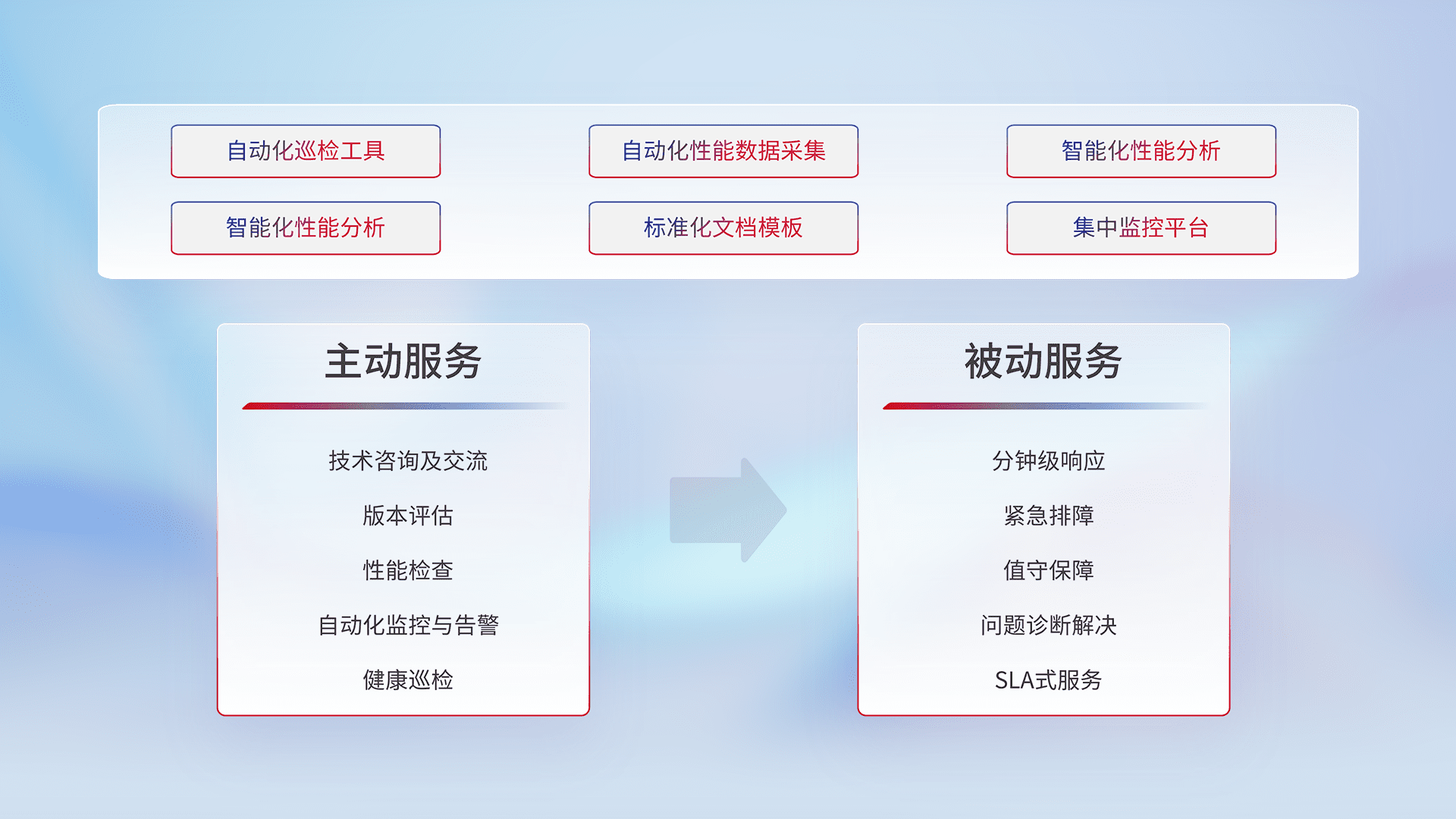 智能化工具和标准化文档,,,保障服务质量,,,,提供主动服务(包含技术咨询、、、、版本评估、、、性能检查、、、、自动化监控与告警、、健康巡检)和被动服务包含(分钟级响应、、、、紧急排障、、、值守保障、、、、问题诊断解决、、、、SLA服务)。。。。